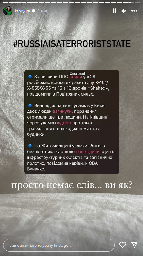 Илона Гвоздева отреагировала на ночную атаку Киева / Скриншот с инстаграмм-сторис