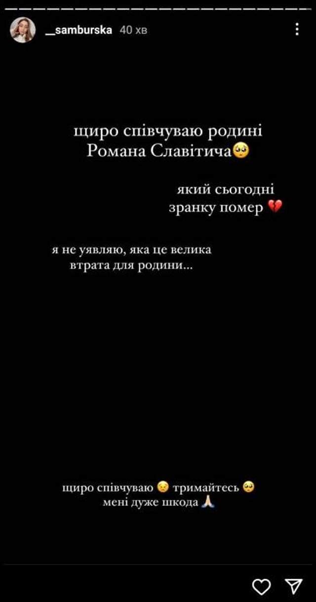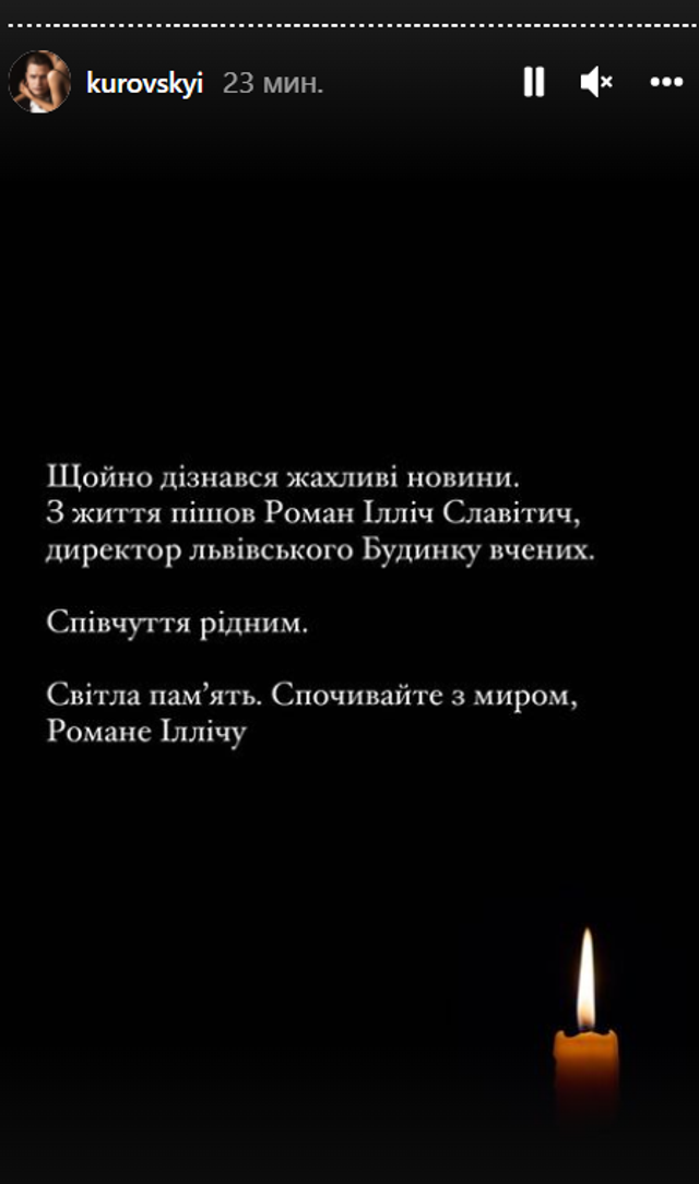 Но через некоторое время Александр удалил сторез с этим текстом, опубликовав новую: "Только что узнал ужасные новости. Из жизни ушел Роман Ильич Славитич, директор львовского Дома ученых. Соболезнования родным. Светлая память. Почивайте с миром, Роман Ильич.