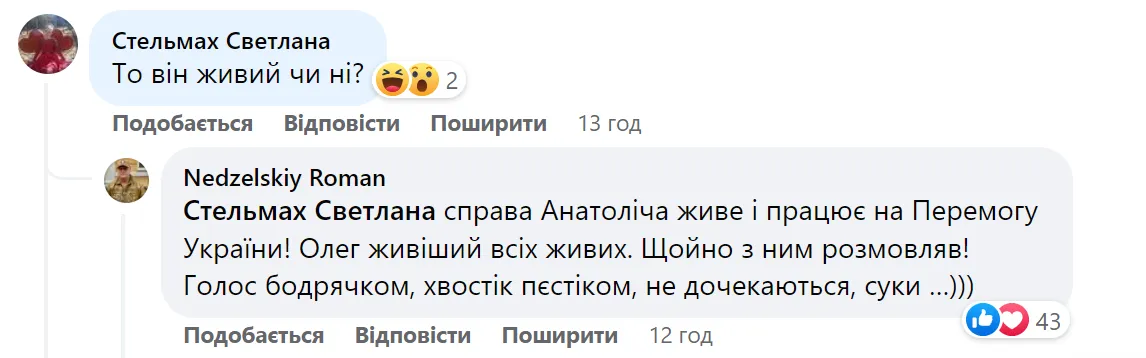 Дело Анатолича живет и работает на победу Украины! Олег живее всех живых. Только что с ним разговаривал! Голос бодрячком, хвостик пестиком, не дождутся, с*ки,