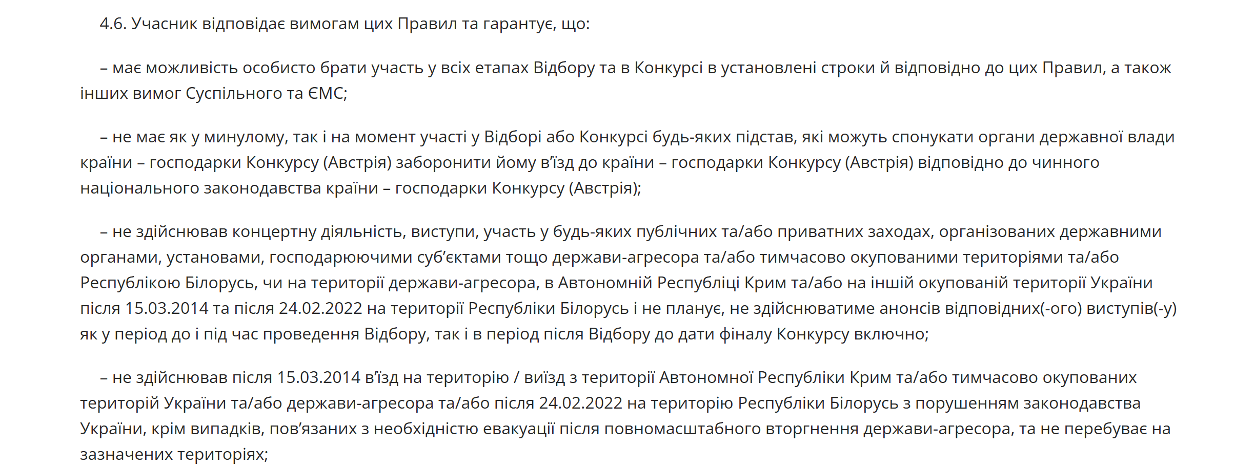 Дело в том, что, исполнители, которые хотят стать участниками Национального отбора на Евровидение, не должны выступать, участвовать в мероприятиях или посещали территорию России, Беларуси или оккупированных частей Украины после 2014 года (а для Беларуси – после 2022 года), и не планируют этого делать. Также они не должны пересекать границу с этими территориями с нарушением украинского законодательства. Об этом написано в правилах, которые размещены на сайте Общественное Евровидение.