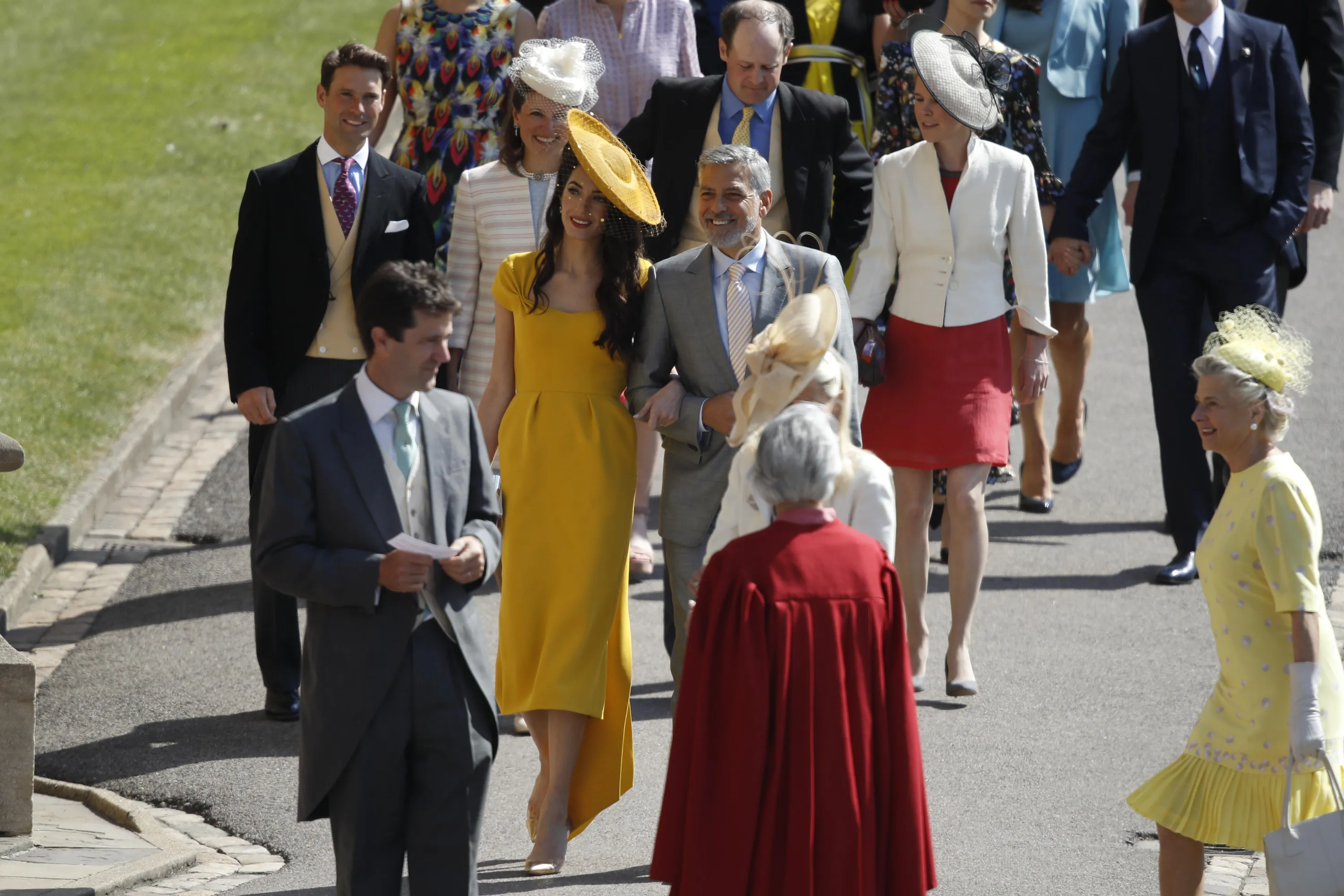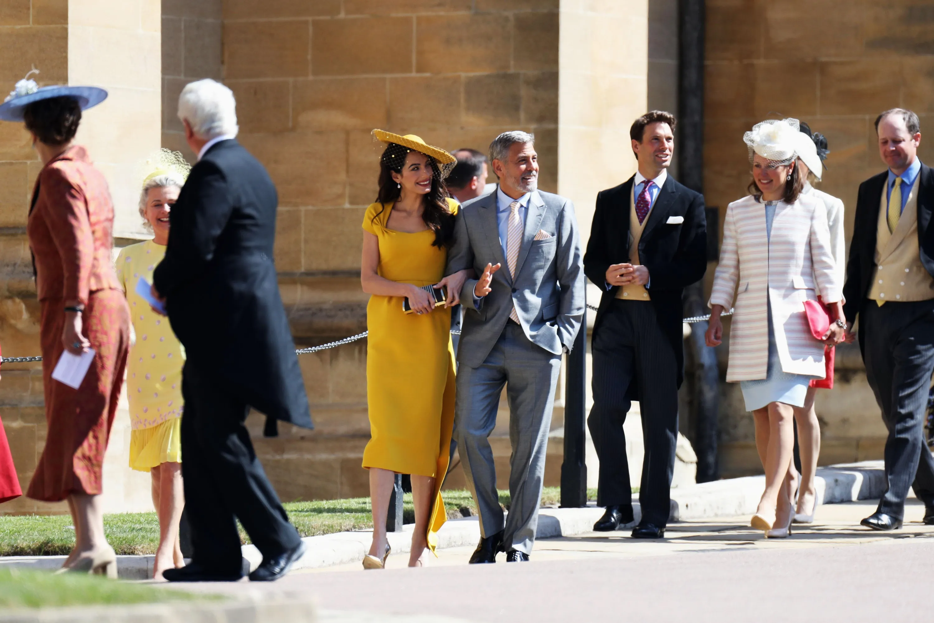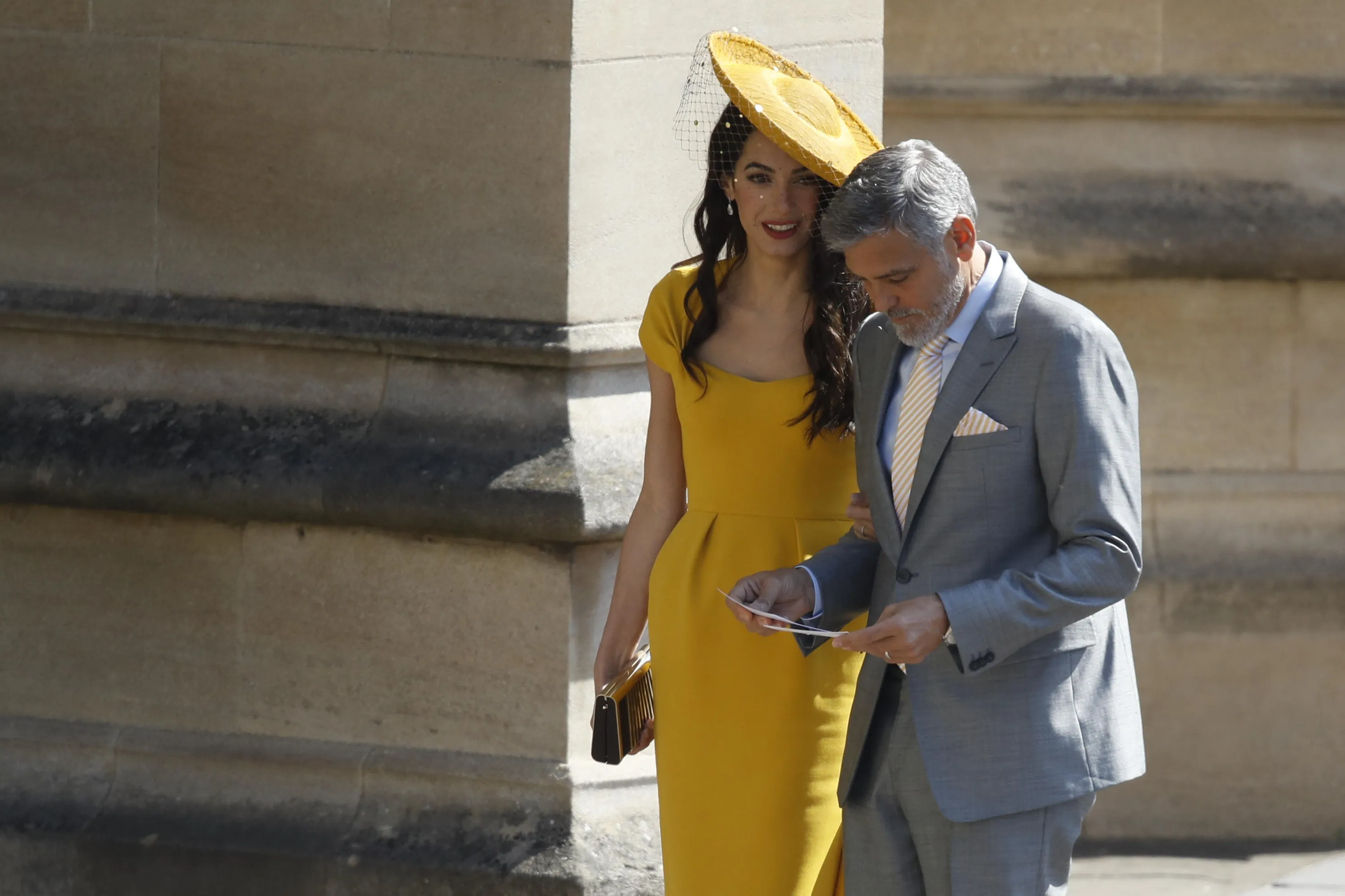 Одними из таких сторонников новоиспеченного будущего супружества стали известные Джордж и Амаль Клуни, которые будут присутствовать в часовне во время свадебной церемонии. На историческое событие несравненная Амаль Клуни надела солнечное желтое платье ниже колен с небольшим шлейфом сзади. Успешный юрист и светская львица также примерила очаровательный головной убор такого же цвета с нежной вуалью. Свой образ Амаль дополнила желтыми каблуками и лаконичным черным клатчем с золотистым обрамлением.