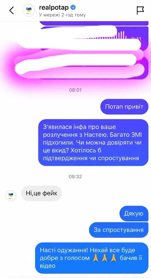 С публичным заявлением Потап не выступил, но прокомментировал слухи в личной переписке с блогером Ростиславом Калацинским. Скрин с ответом рэпера тот показал на своем ютуб-канале.