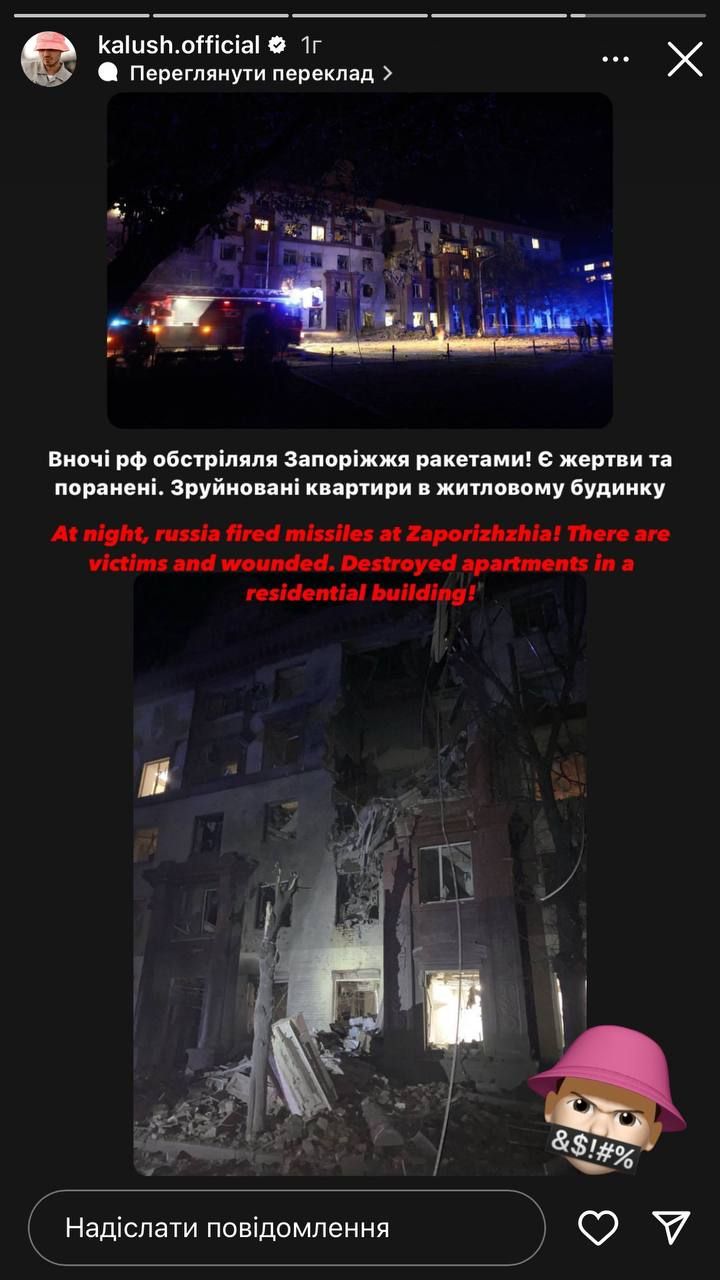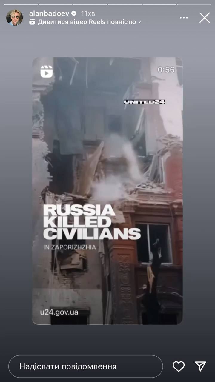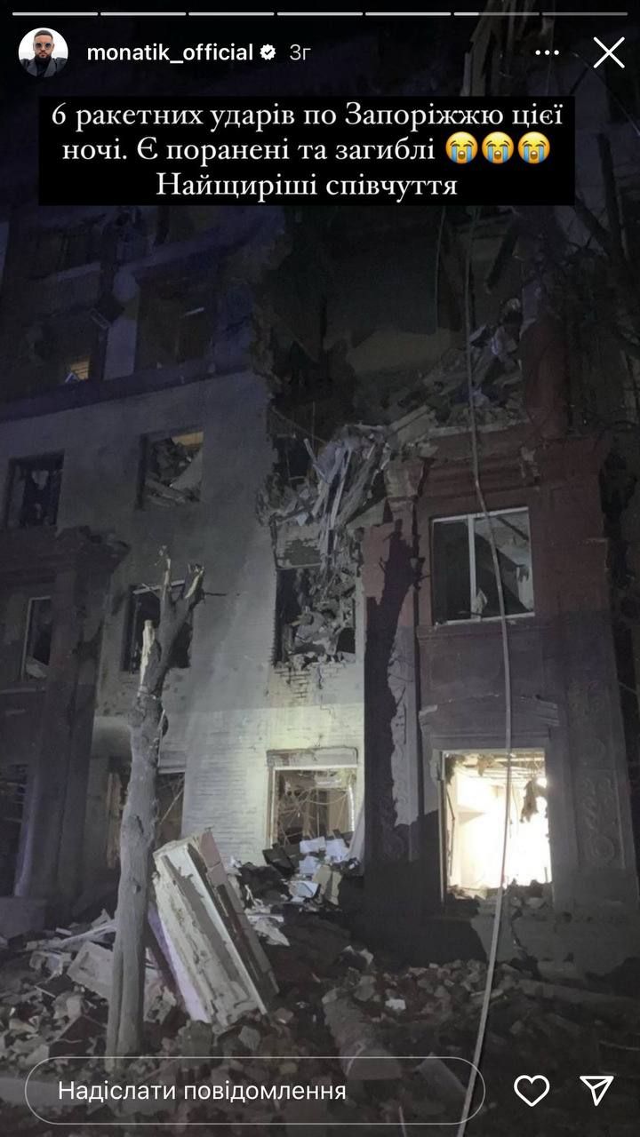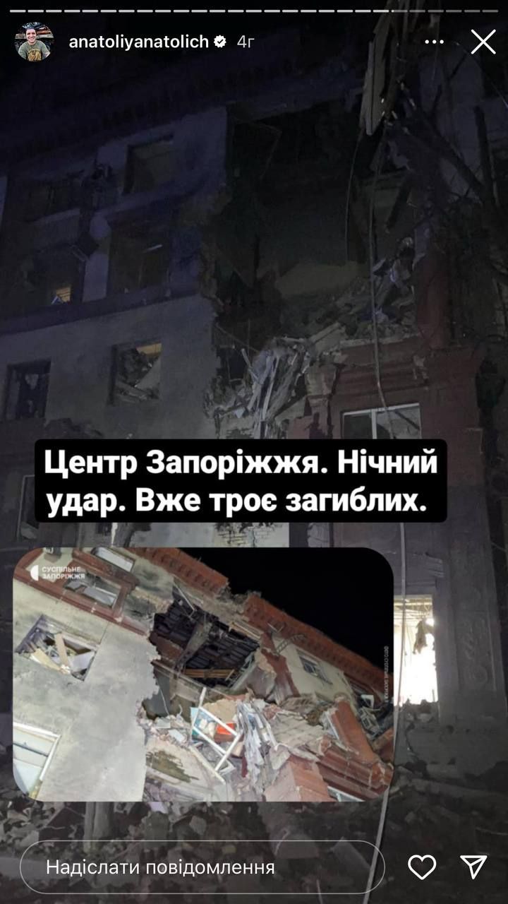 Артист выставил инстаграмм-сторис с последствиями атаки по Запорожью и подчеркнул, что россияне снова обстреляли мирное население.