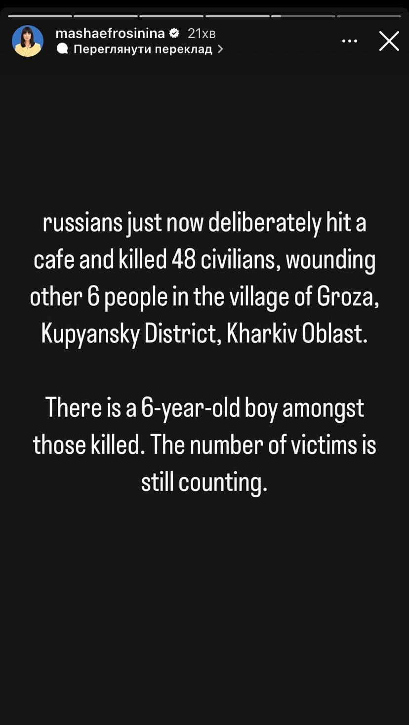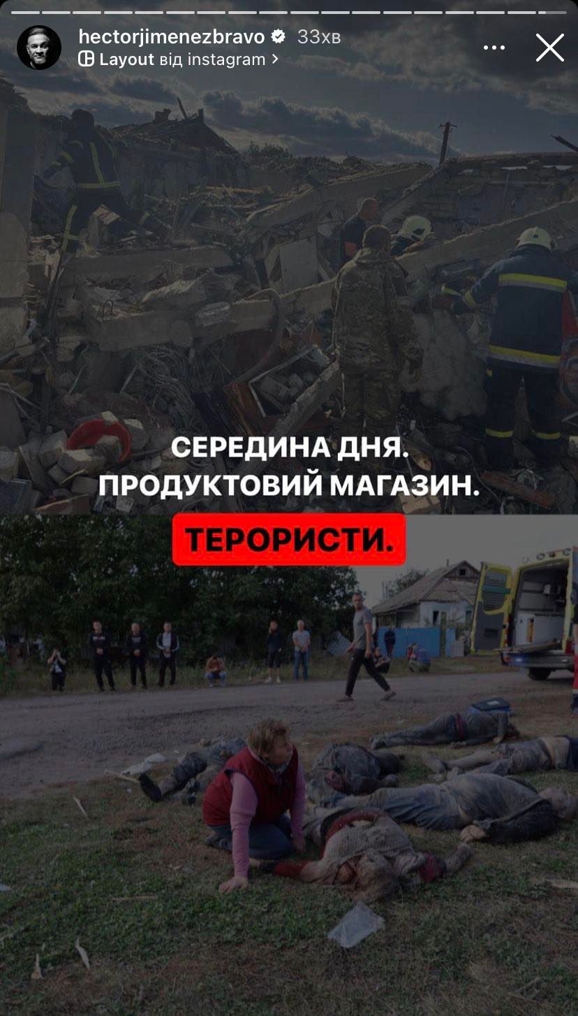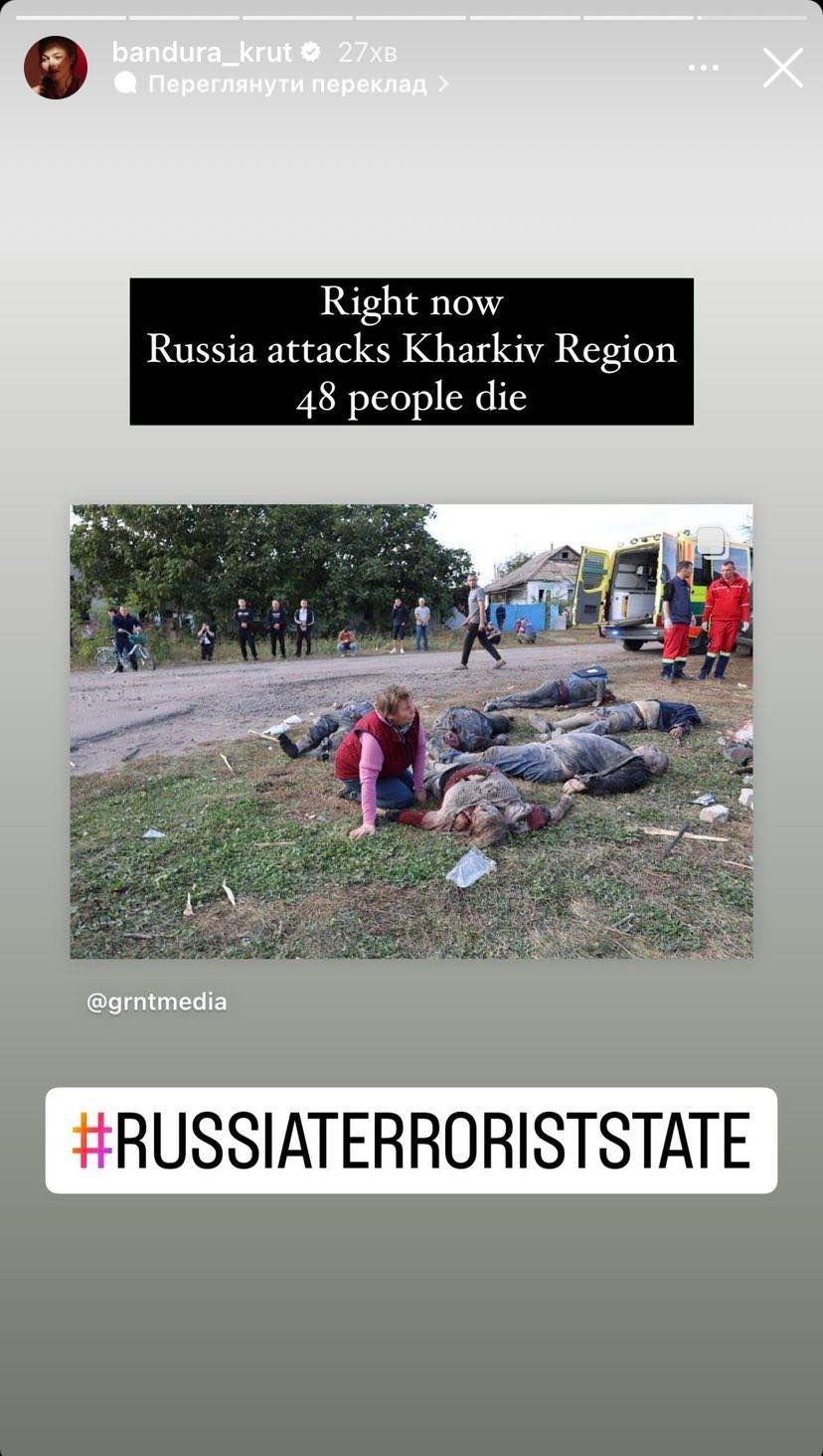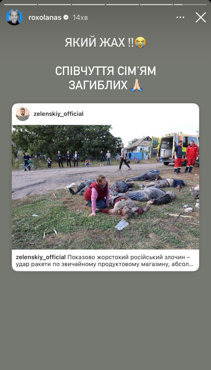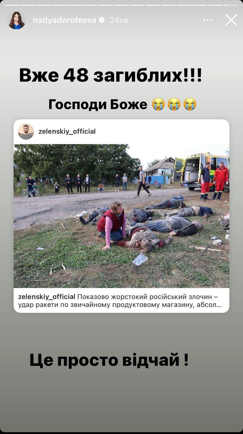 Артистка также поделилась в своих инстаграмм-сторис последствиями российской атаки по поселку Гроза. Она добавила: "Какой ужас! Какое горе".