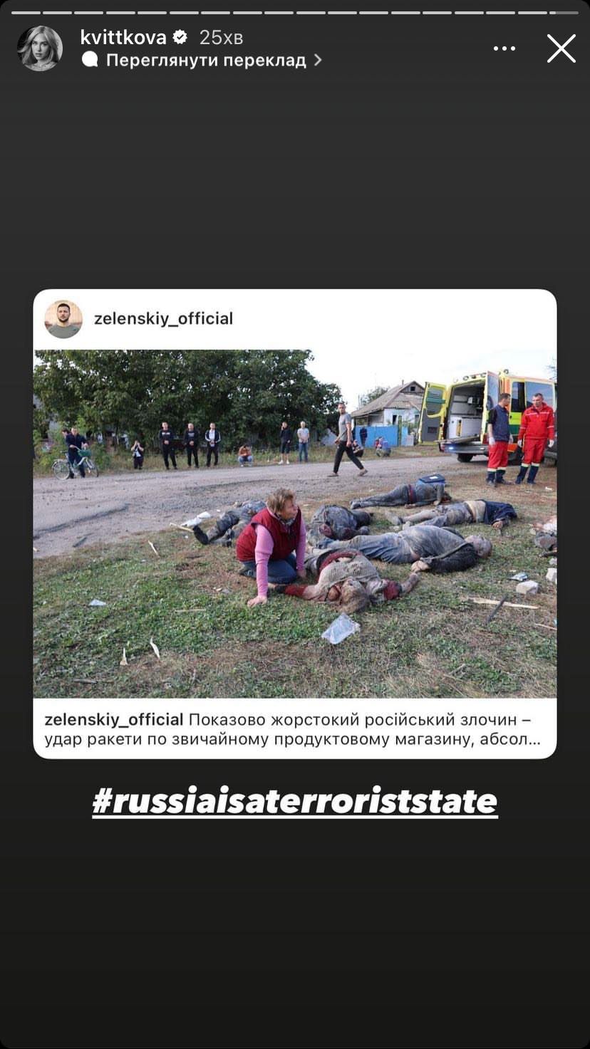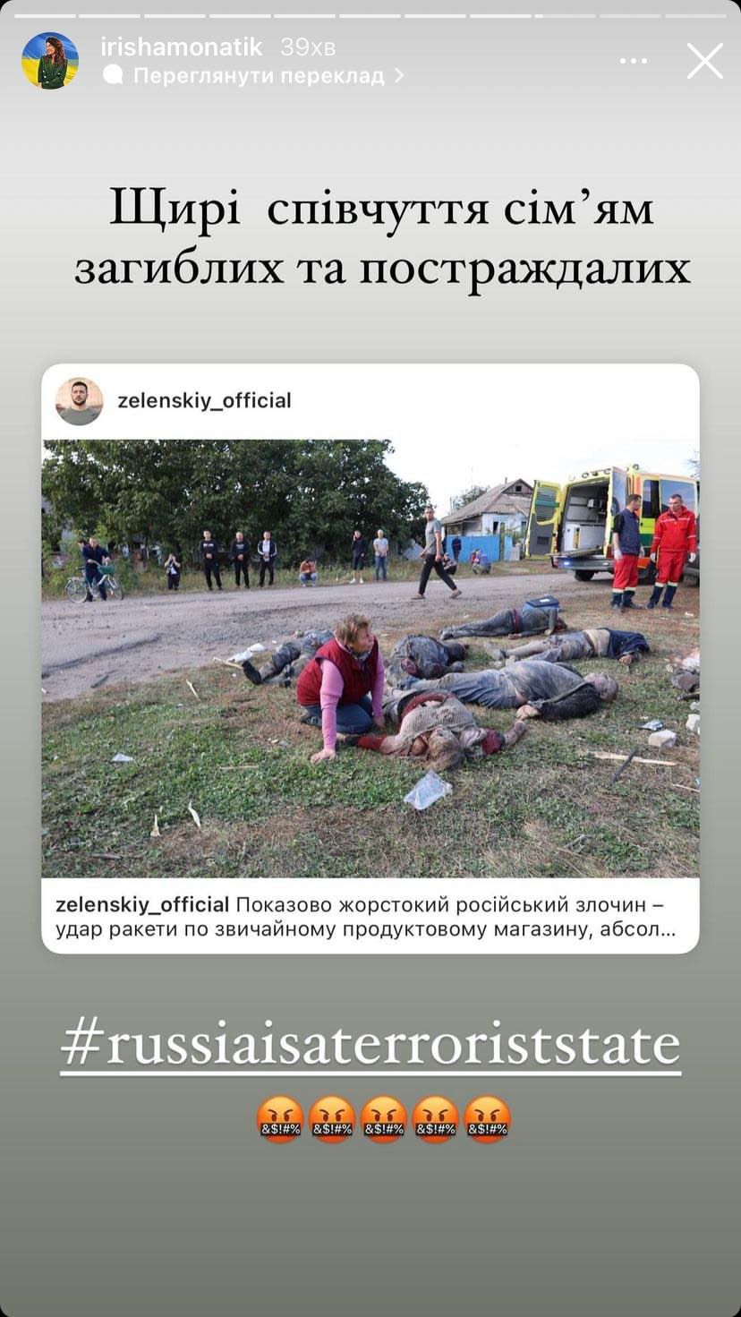 Знаменитость распространила инстаграмм-сторис с последствиями прилета. Кроме того, она выставила пост о циничной атаке россиян и показала ужасающие кадры с места событий.