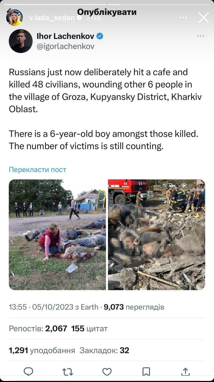 Певец также поделился фотографиями с последствиями удара по кафе и магазину. Он сопереживает родным раненых и погибших и сказал, что Россия – это страна-террорист.