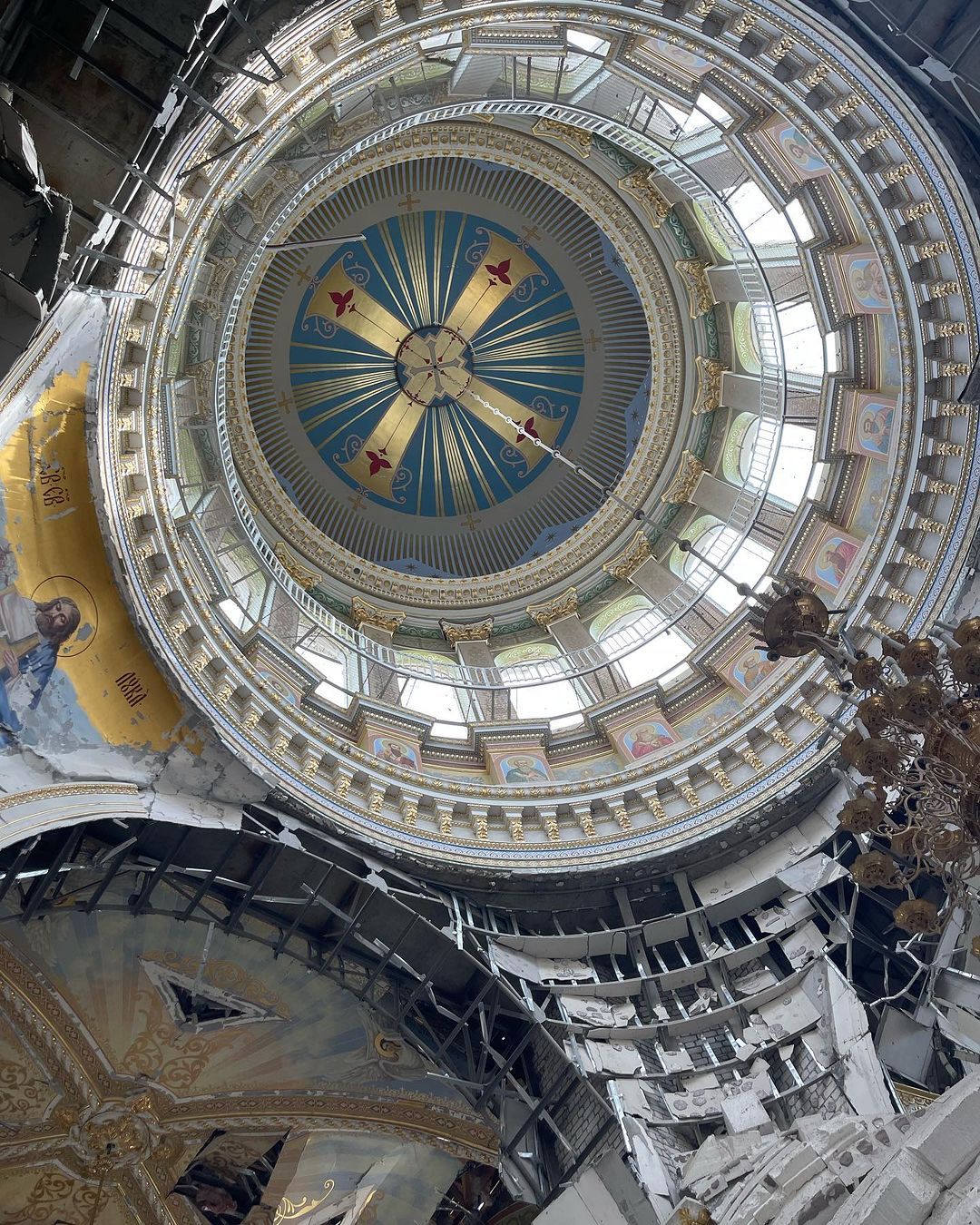 Ведущий рассказал, что спать ночью не удалось, а с утра вышло зайти в Спасо-Преображенский собор и сделать фото, как россияне разрушили храм. "Служители храма очень молчаливы, не готовы общаться, а коммунальщики радуются, что живы".
