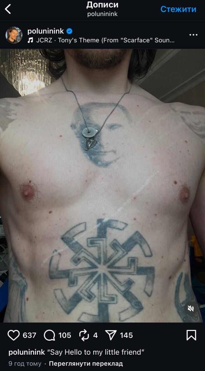 Хореограф запостил фото своего обнаженного торса. На фото можно разглядеть различные его тату, в частности, на груди у Сергея Полунина набиты три лица российского диктатора Владимира Путина.