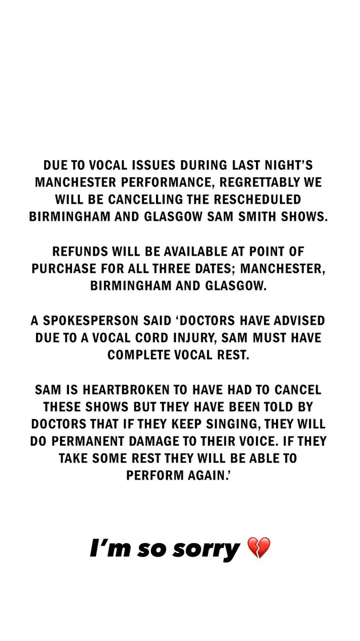 "Врач посоветовал, что из-за травмы голосовых связок, Сэм должен иметь полное голосовое спокойствие. Сэм разбит горем из-за того, что ему пришлось отменить эти шоу, но врачи сказали, что если он продолжит петь, то нанесет окончательный вред своему голосу. Если он немного отдохнет, то сможет выступать снова".