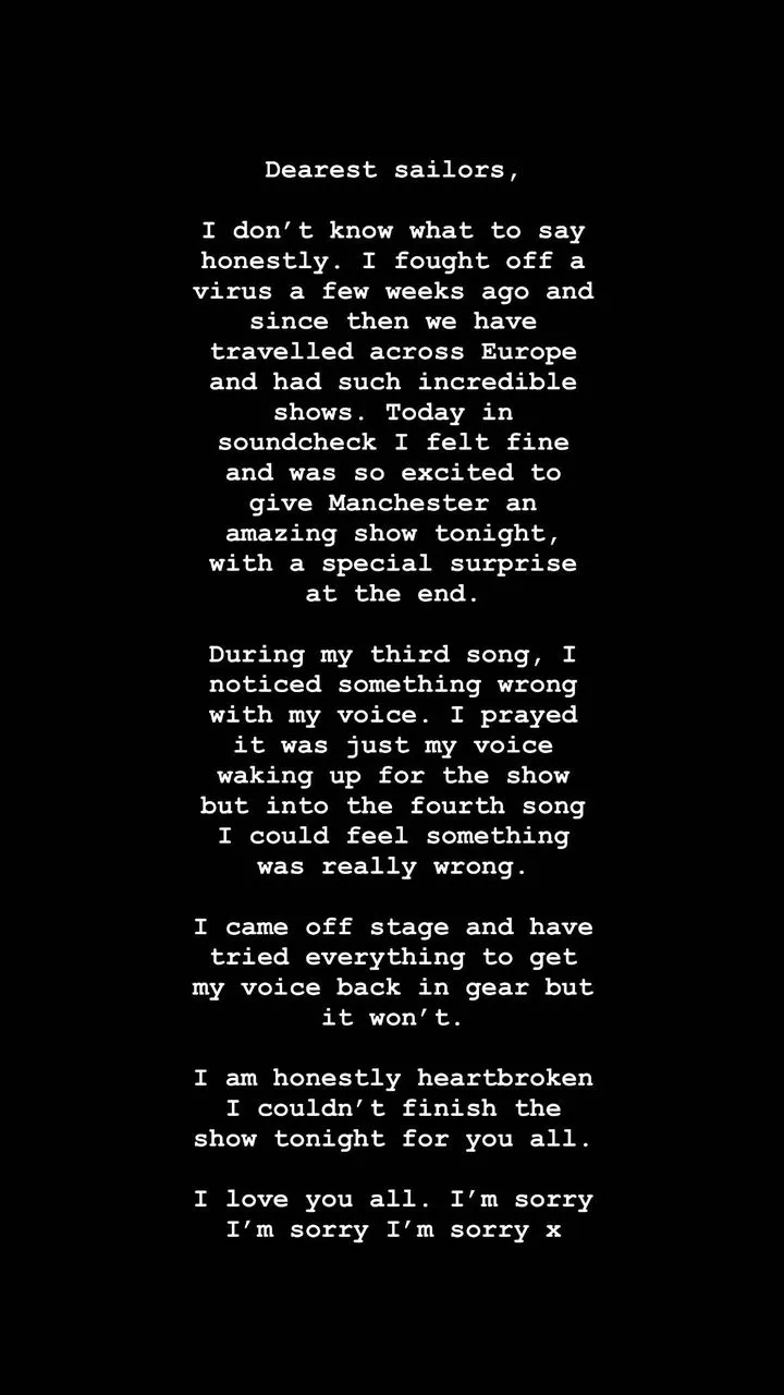 Позже на странице артиста появились новые детали. Он отменил предстоящие шоу в Бирмингеме и Глазго. Однако зрителям вернут деньги за билеты на эти концерты и концерт в Манчестере.