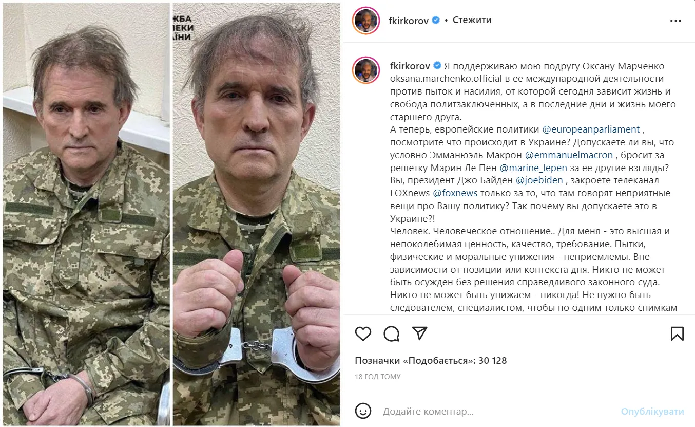 "Не нужно быть следователем, специалистом, чтобы по одним только снимкам понять, что происходит и делается с Виктором Медведчуком. Обращаюсь с требованием к европейским политикам – немедленно подключиться, вывести из подвалов СБУ всех людей и провести независимое расследование", – призвал Киркоров.