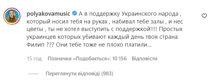 - Оля Полякова: "А в поддержку украинского народа, который носил тебя на руках, набивал тебе залы, и нес цветы, ты не хотел выступить с поддержкой! Простых украинцев, которых каждый день убивает твоя страна, Филипп? Они тебе тоже неплохо платили".