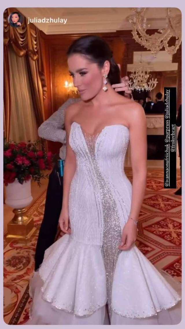 - после завершения официальной части Иванна переоделась в платье-бюстье с серебряной вышивкой и воланами от украинского дизайнера Ивана Фролова.
