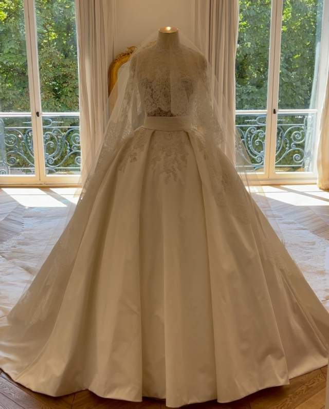 Жасмин выбрала платье от модельера ливанского бренда Zuhair Murad: с пышной атласной юбкой и кружевным верхом с длинными рукавами и горловиной. Также образ невесты дополняла длинная фата, которая крепилась на затылке модели с помощью нежного венчика.