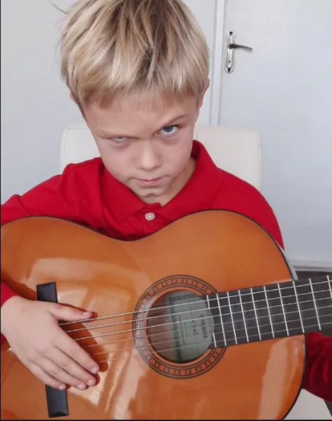 Артист поделился новым фото младшего сына Марка. 8-летний мальчик смешно поднял одну бровь и смотрел в камеру из-под лба. В руках он держал гитару.