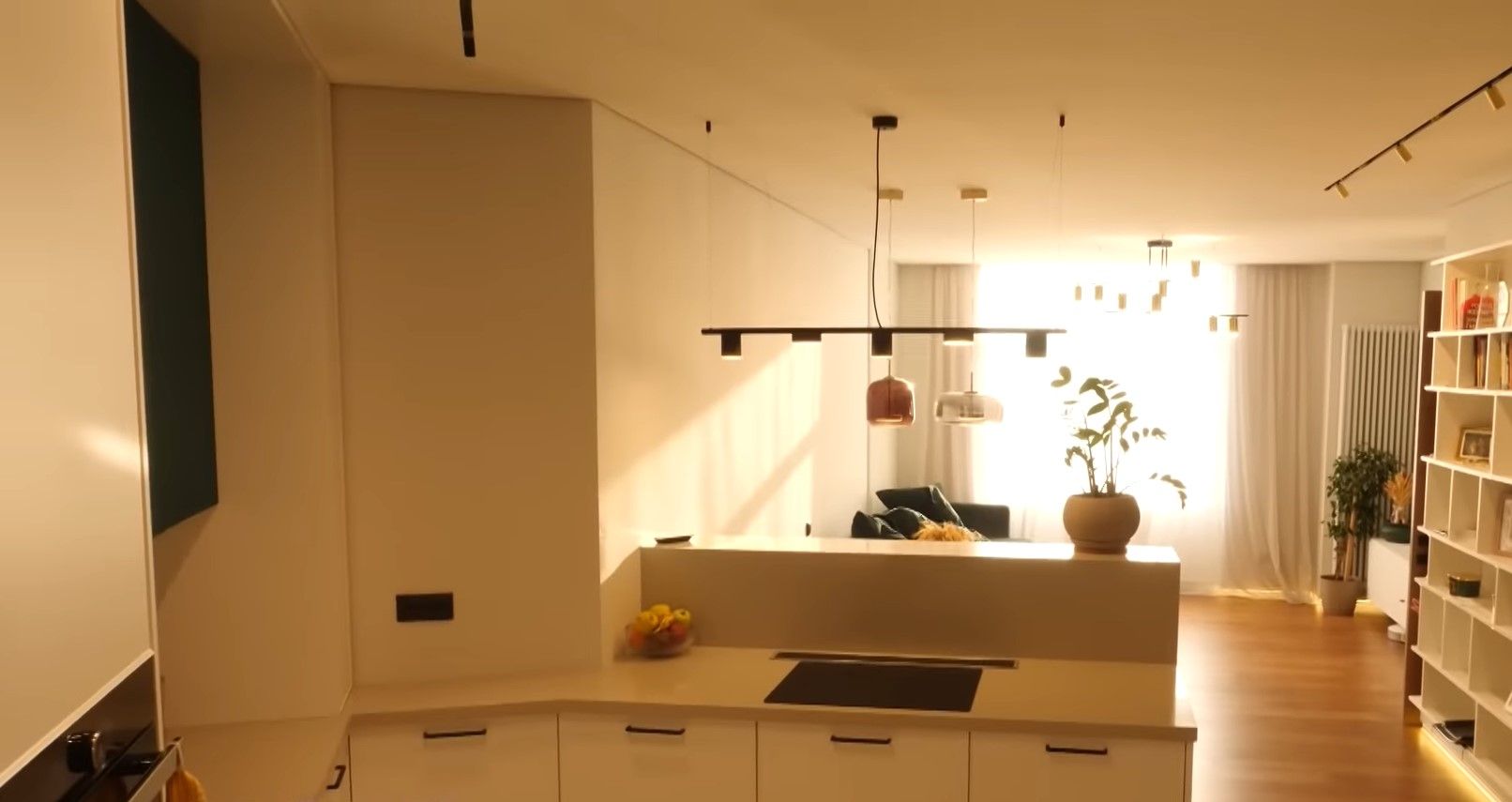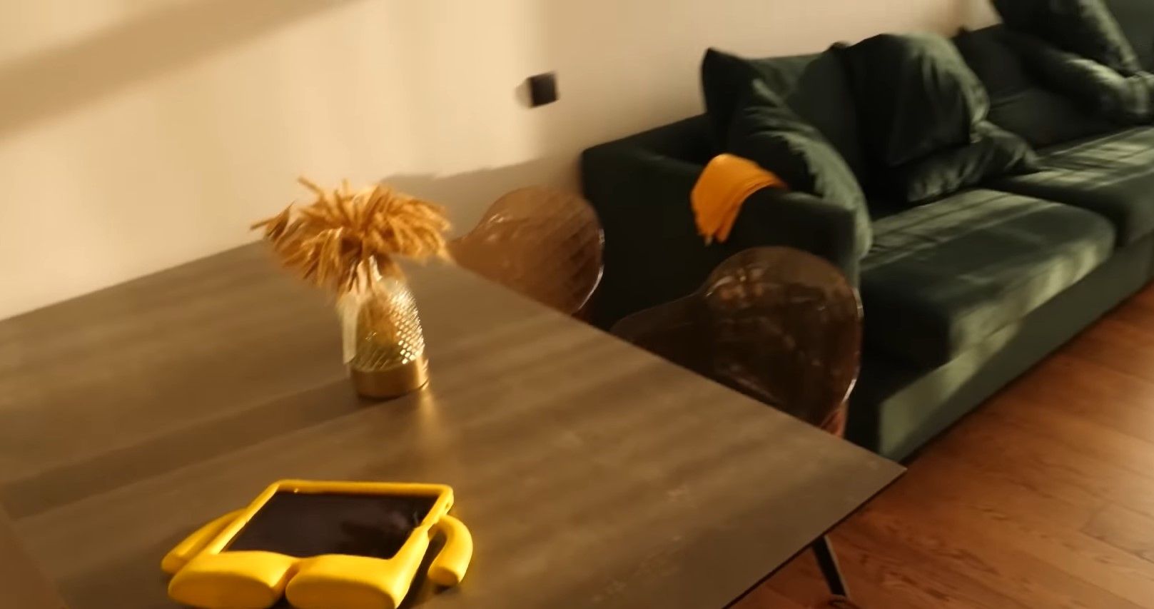 Квартира Тимура Мирошниченко расположена в одном из столичных комплексов возле Днепра. Больше времени семья проводит в кухне-студии, где есть и стол, и большой изумрудный диван, где уместятся все.