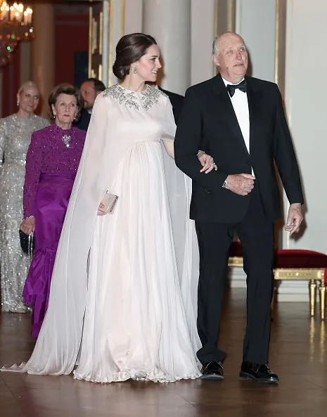 Для посещения Норвегии очаровательная Кейт Миддлтон выбрала вечернее платье от Alexander McQueen. Светлые наряды очень идут беременной герцогине и изящно подчеркивают ее состояние. У платья был классический шлейф и оно было украшено темным бисером и стразами. Идеальная прическа и роскошные украшения дополнили образ Кейт Миддлтон.