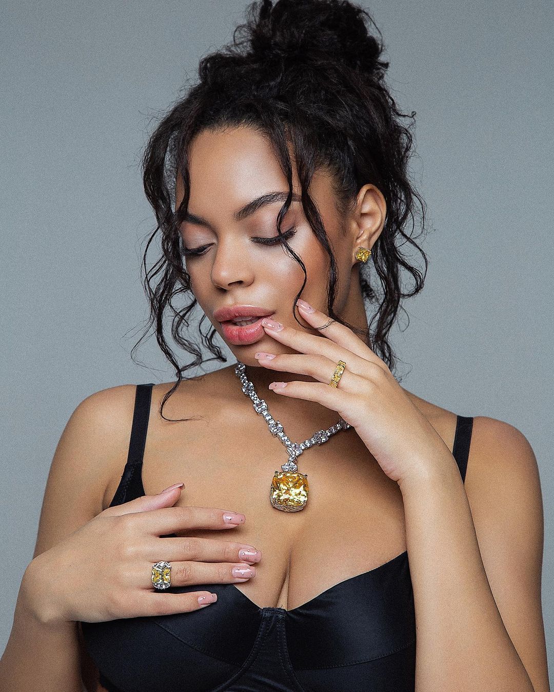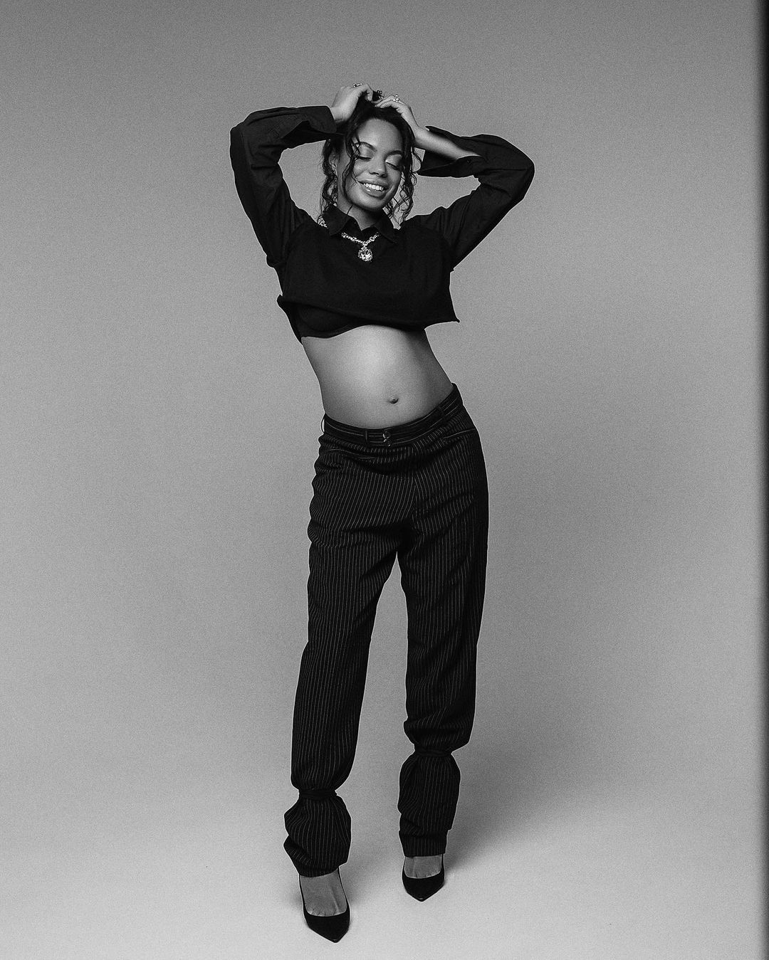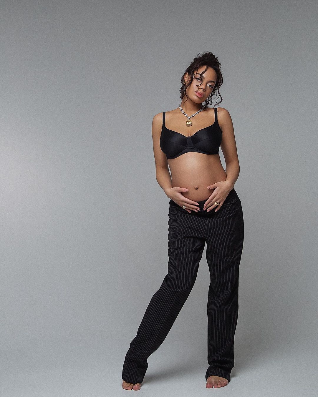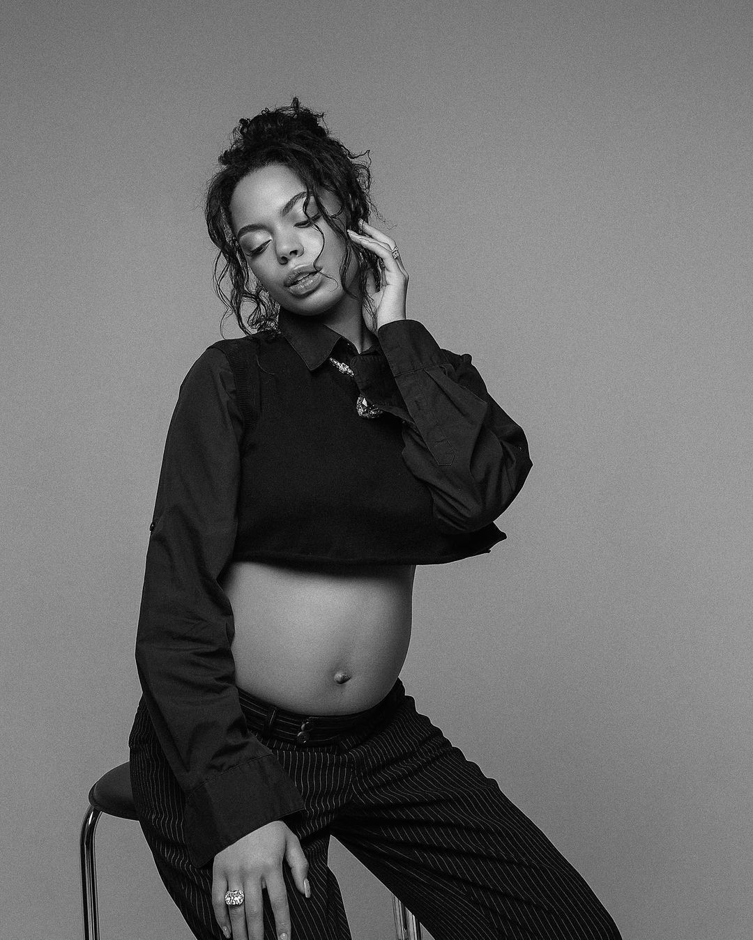 Аделина Дели позировала в фотосессии, подчеркнув беременное состояние. Она одела черный лиф и укороченное худи, которые соединила с темными брюками в полоску. Танцовщица дополнила образ массивными аксессуарами – подвеской и кольцом в одинаковом стиле.