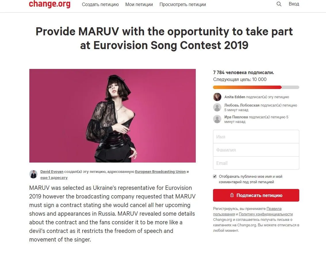 В электронной петиции отмечается, что пользователи просят предоставить певице MARUV возможность принять участие на Евровидении-2019 в Израиле. Автором петиции стал пользователь Давид Эвоян (David Evoyan), а направлена она в Европейский вещательный союз (European Broadcasting Union).
