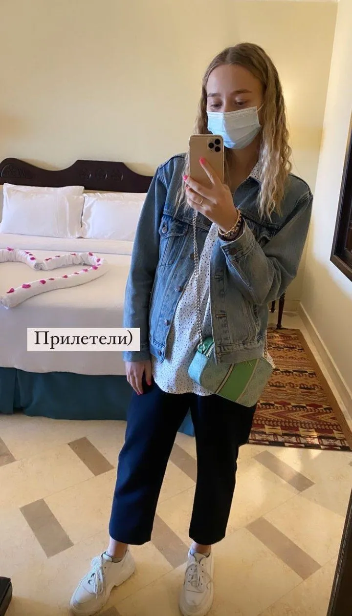 Также возлюбленная артиста показала яркие фото с отдыха. Первым делом она сделала селфи в зеркале комнаты отеля. Она позировала в нежной белой блузке с принтом и синих стильных брюках. Образ Екатерины дополняла джинсовая куртка, зеленая сумочка через плечо и белые кроссовки.