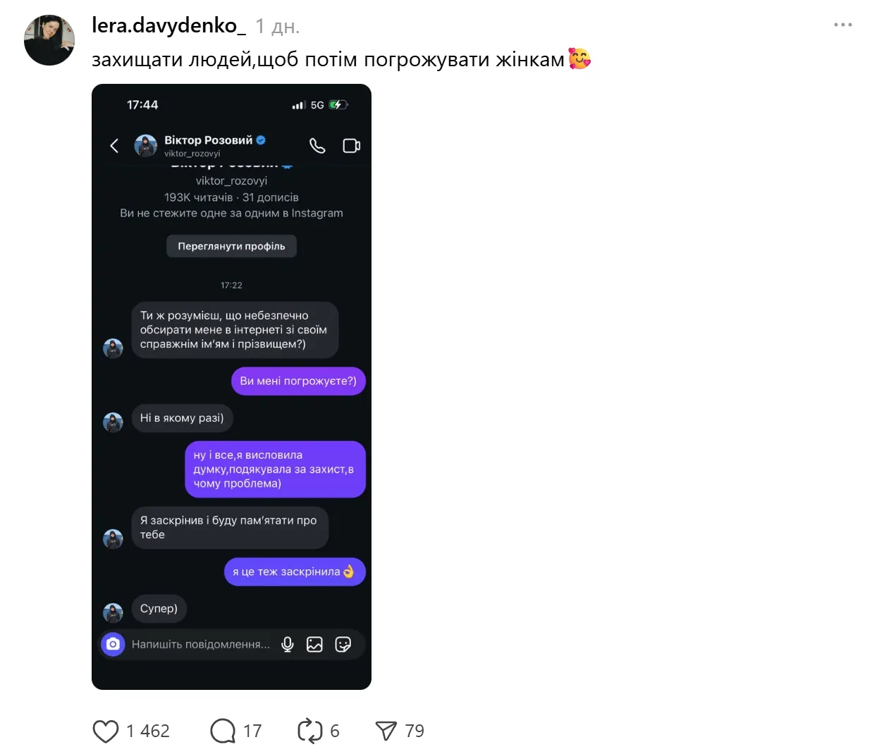 Одна из пользовательниц даже показала личную переписку с Розовым. В сообщениях мужчина намекнул, что может быть опасно публично критиковать его, используя настоящие имя и фамилию. По ее мнению, это звучало как прямая угроза. Сам Виктор отрицает это, но отметил, что сохранил скриншот ее комментария на память.