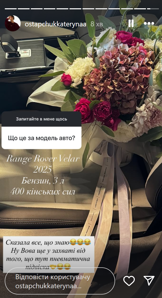 Владимир подарил Екатерине Range Rover Velar 2025 года с бензиновым двигателем объемом 3 литра и мощностью 400 лошадиных сил. На официальном сайте Land Rover указано, что стоит такой автомобиль примерно 3 миллиона 978 тысяч гривен.