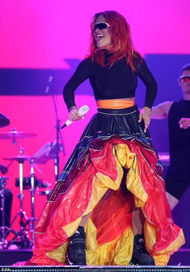Стройное тело артистка засветила на Лондонском стадионе "Уэмбли", сообщает The Daily Mail. К взволнованным зрителям Рита Ора вышла в черном топе и объемной яркой юбке. Сценический образ рыжеволосая певица дополнила спортивной обувью.