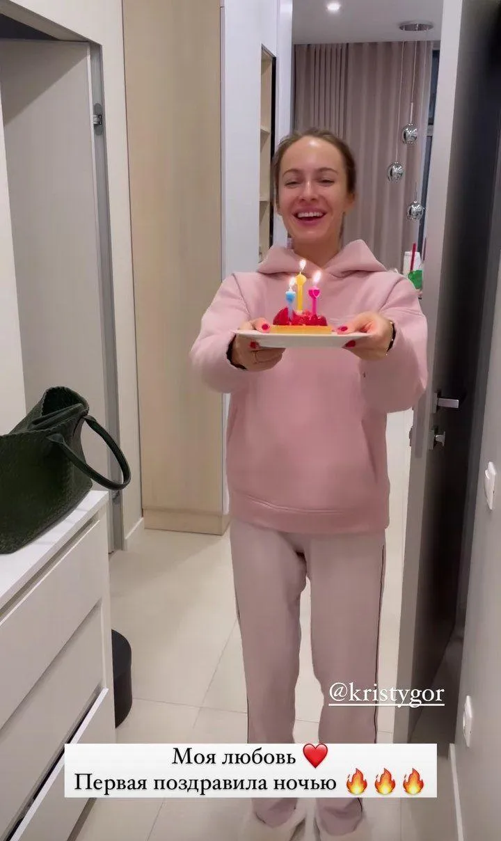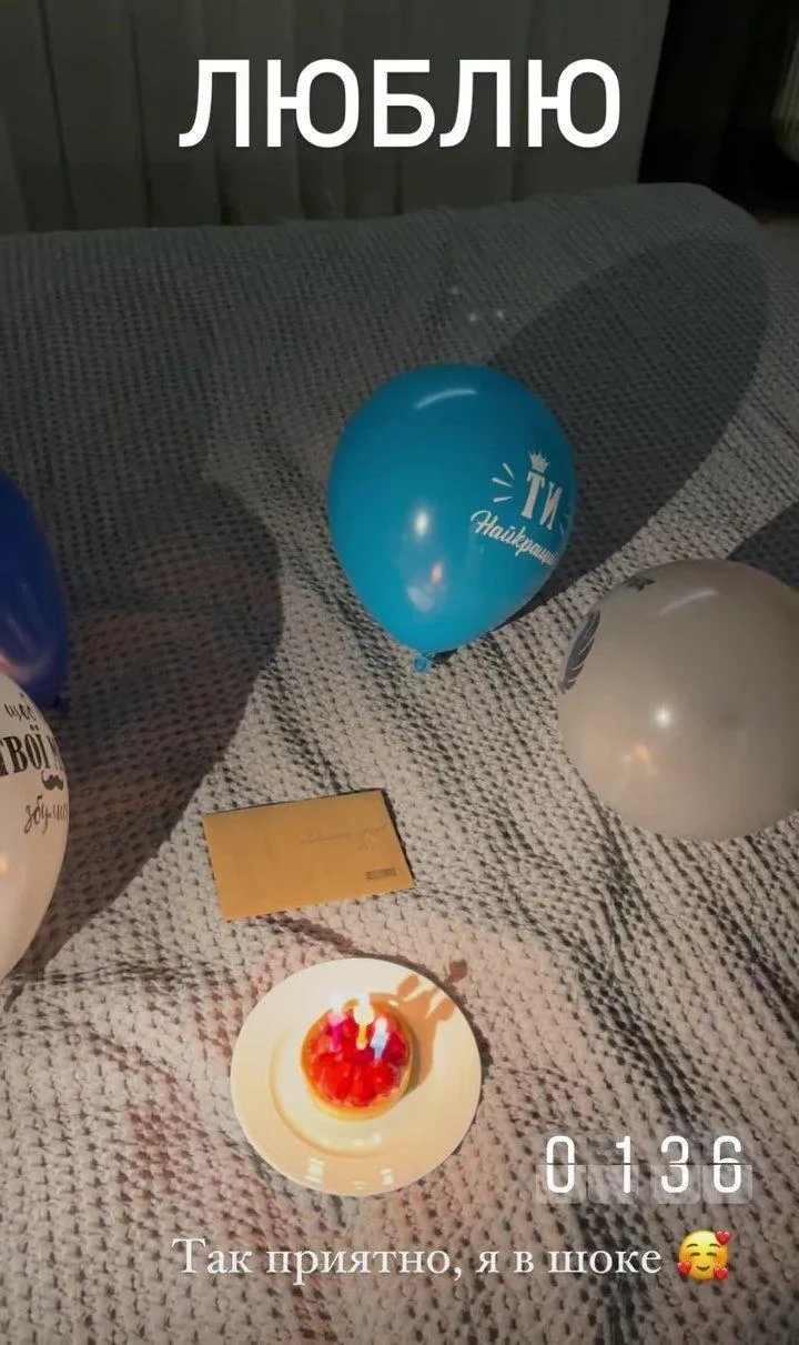 Кристина Горняк ночью приготовила любимому сюрприз. Она представила имениннику небольшое пирожное с праздничными свечами и отвела в спальню. Там его ждали шарики с комплиментами и поздравлениями, а также открытка. Что было там – ведущий не рассекретил.