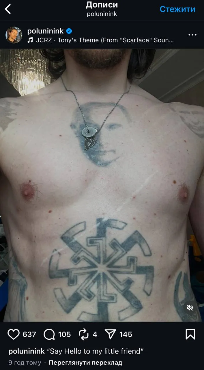Хореограф запостив фото свого оголеного торса. На фото можна розгледіти різні його тату, зокрема, на грудях в Сергія Полуніна набиті три обличчя російського диктатора Володимира Путіна.