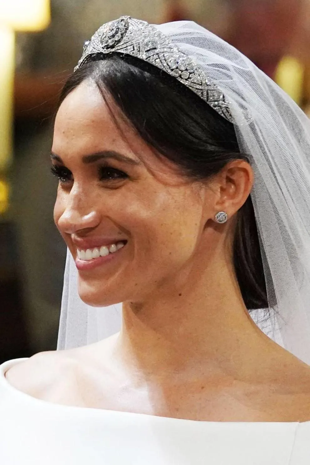 Волосся нареченої прикрашала довга фата від Givenchy і тіара з великою квіткою-брошкою посередині, яка раніше належала королеві Марії Текській наприкінці XIX століття. Бабуся королеви Єлизавети II передала свій головний убір внучці у 1953 році. У свою чергу, Її Величність вирішила передати цінний експонат для весільної церемонії нареченій свого внука принца Гаррі – Меган Маркл.