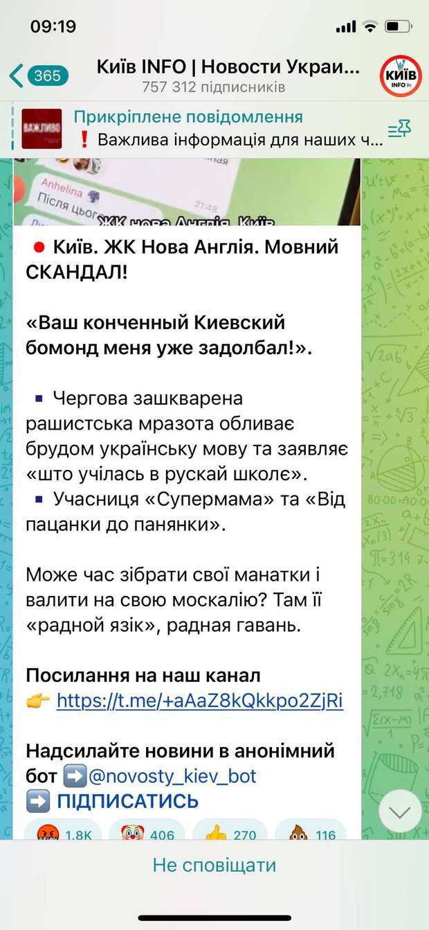 Ірина Слюнько втрапила у мовний скандал / Скриншот посту з ТГ-каналу "Київ Info"