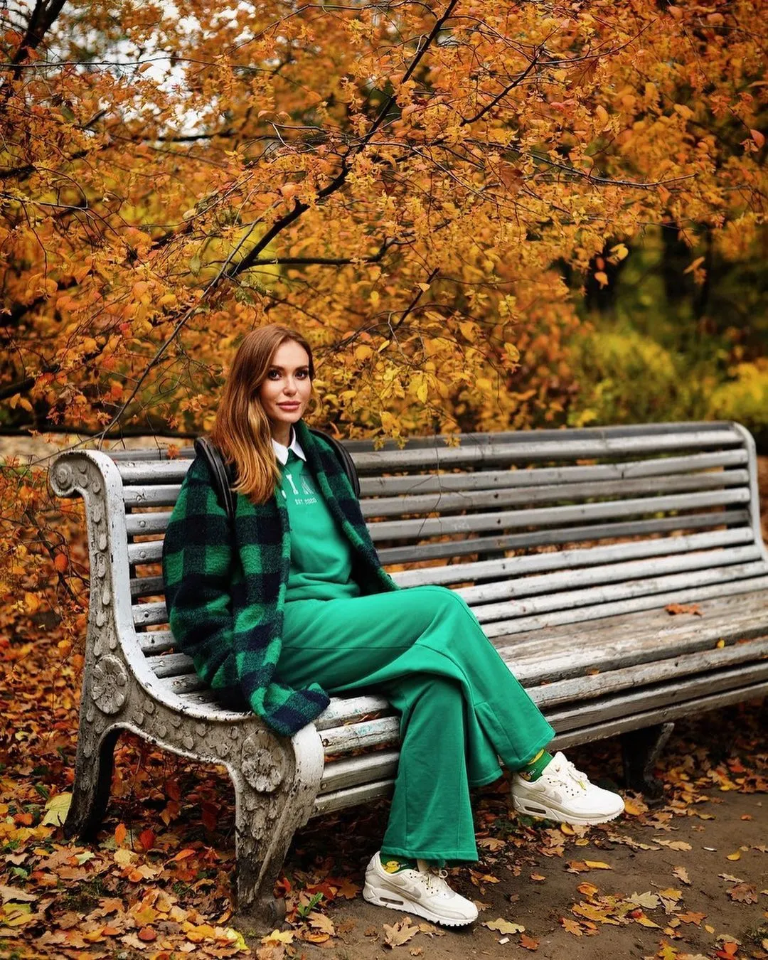 Увагу прихильників також привернув осінній аутфіт артистки. Для прогулянки вона обрала зелений спортивний костюм оверсайз, що складався з худі з написом та стильних широких штанів. Знаменитість доповнила образ клітчастим пальтом та наплічником.