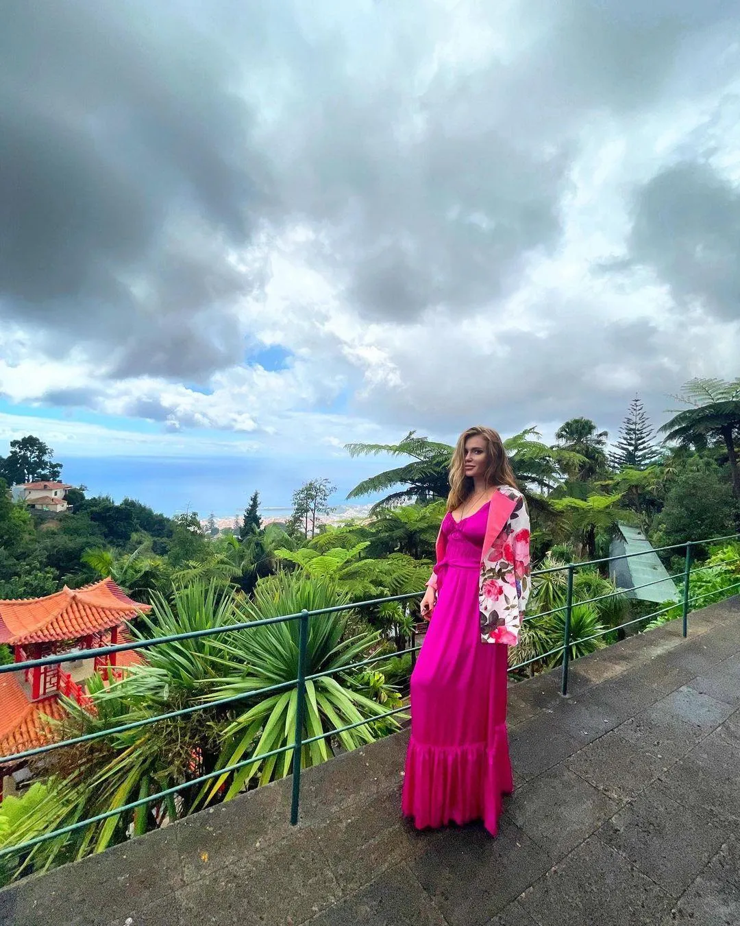 Для прогулянки островом Слава Камінська обрала сукню довжини максі насиченого кольору фуксії з широкою спідницею. Зверху вона накинула білий жакет з різнобарвним квітковим принтом.