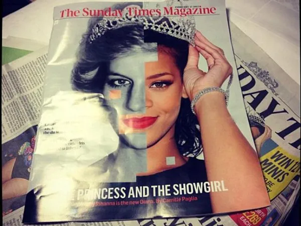 "Коли твоє обличчя "зшите" з обличчям принцеси Діани на обкладинці The Sunday Times Magazine ... Це означає, що у мене екстраординарна поведінка", - написала Ріанна у своєму мікроблозі, коментуючи обкладинку видання.