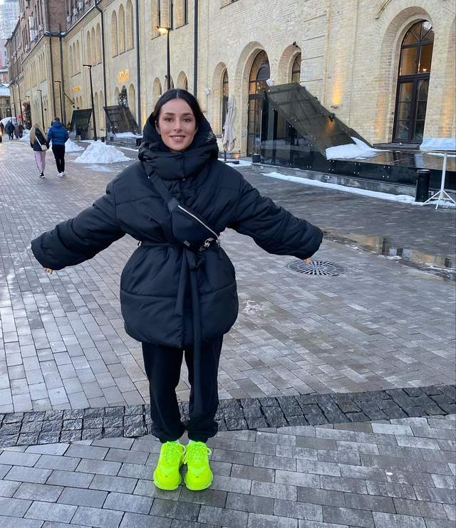 Оскільки на вулиці було досить прохолодно, то поверх худі Злата одягнула чорний пуховик. Волосся цього разу вона рішила акуратно зібрати ззаду, а на обличчі зробила легкий макіяж у нюдових відтінках з акцентом на губах, які нафарбувала помадою.
