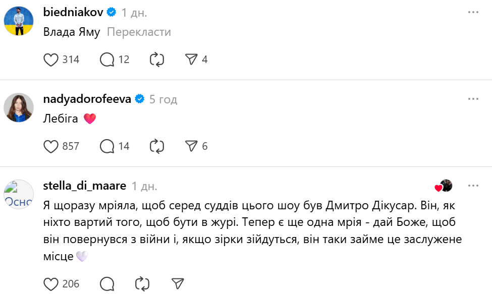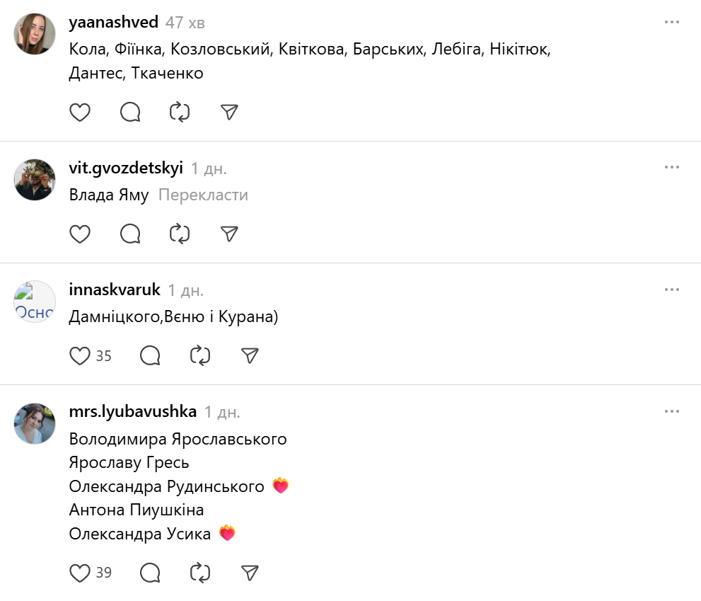 Чимало користувачів підтримали цю ідею. Судячи з коментарів, найбільше на екрані українці хочуть бачити таких зірок: танцівника Влада Яму, співаків Макса Барських, KOLA і Володимира Дантеса та блогерів Дашу Квіткову й Михайла Лебігу.