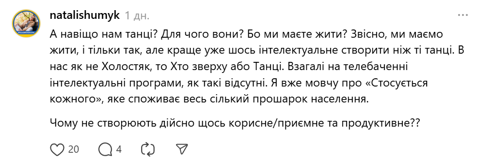 Водночас були й ті, кому ідея з танцювальним шоу не прийшлася до душі. Одна з користувачок вважає, що замість цього на телебаченні варто робити програми, які нестимуть користь для глядачів.