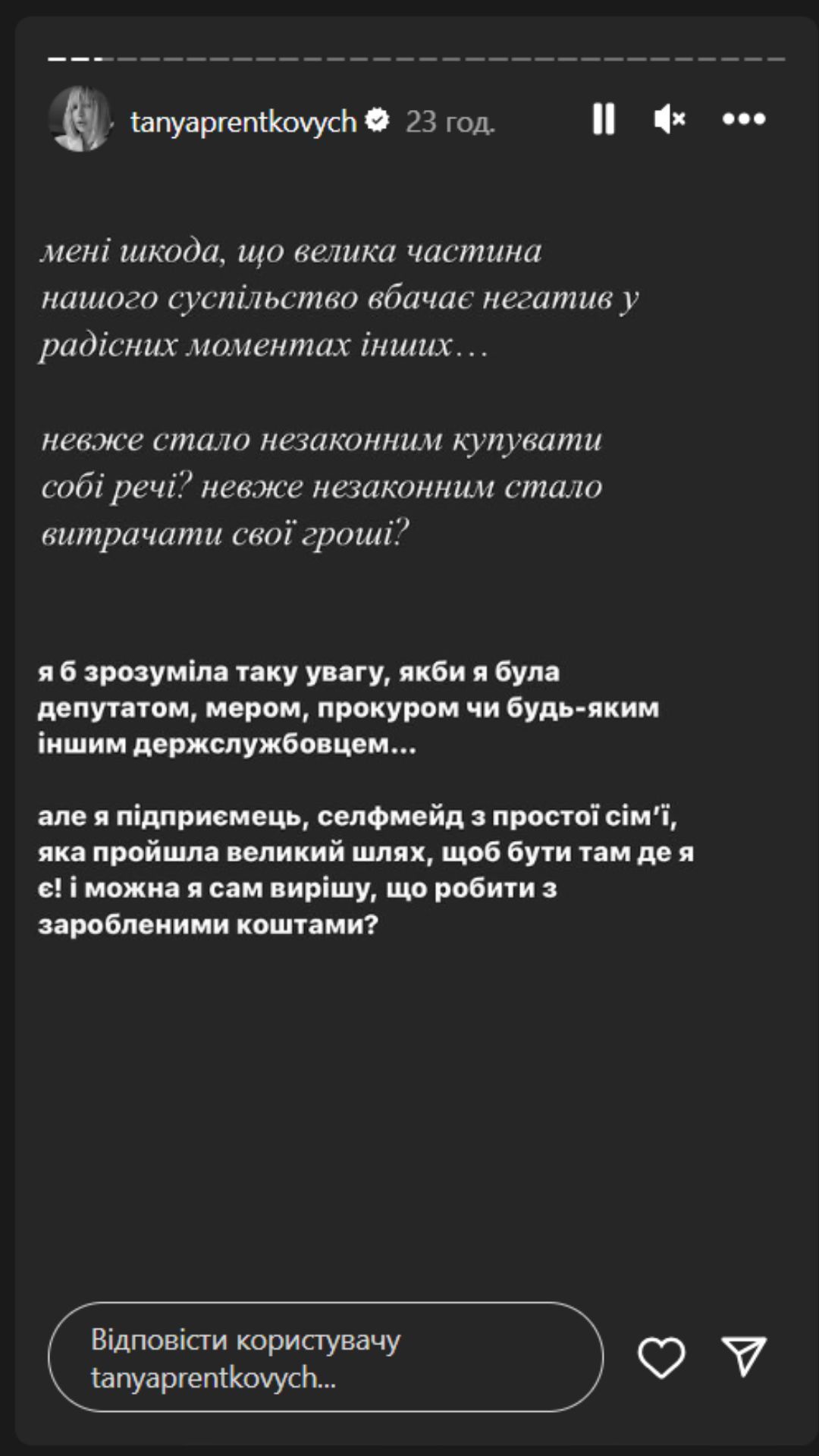 Блогерка зазначила, що не розуміє, чому люди так негативно сприйняли те, як вона витратила свої гроші і додала, що має цілковите право розпоряджати коштами так, як вважає за потрібне, адже сам ж їх і заробила.