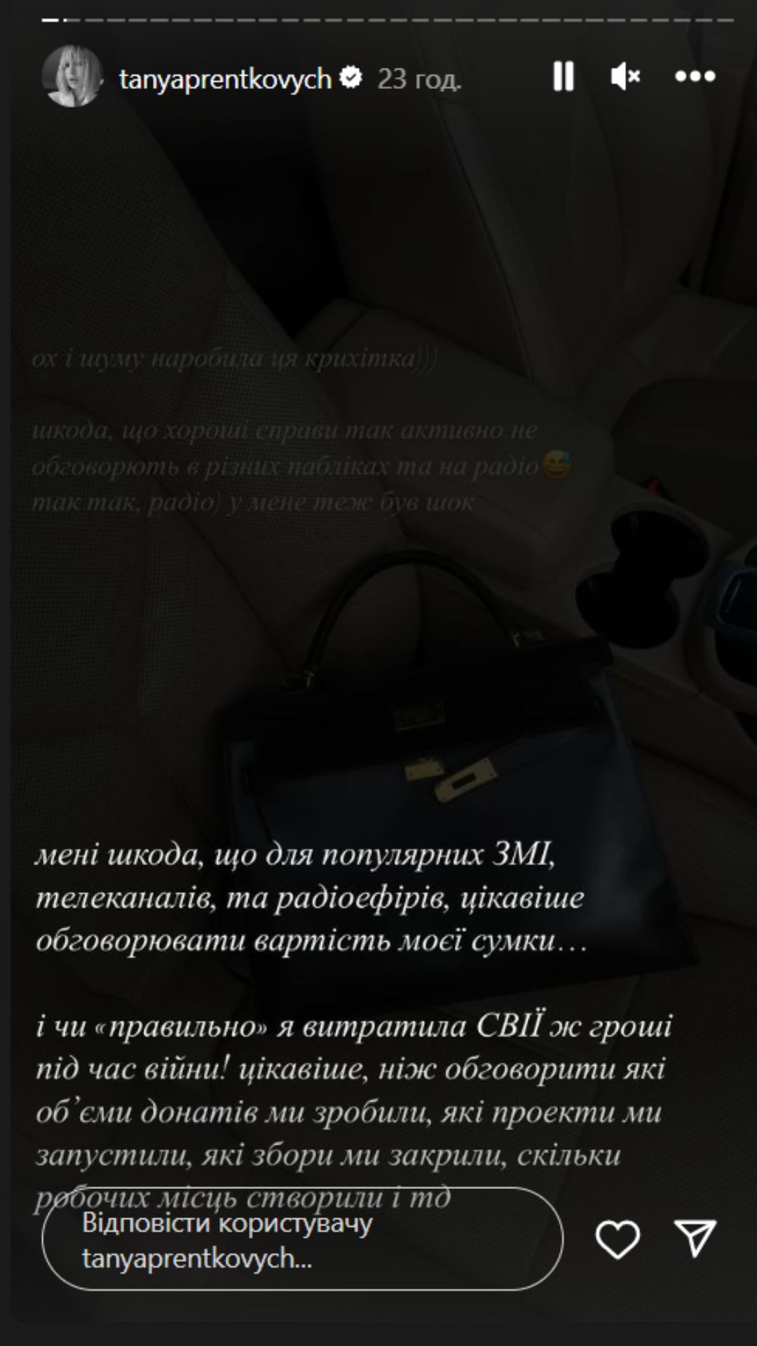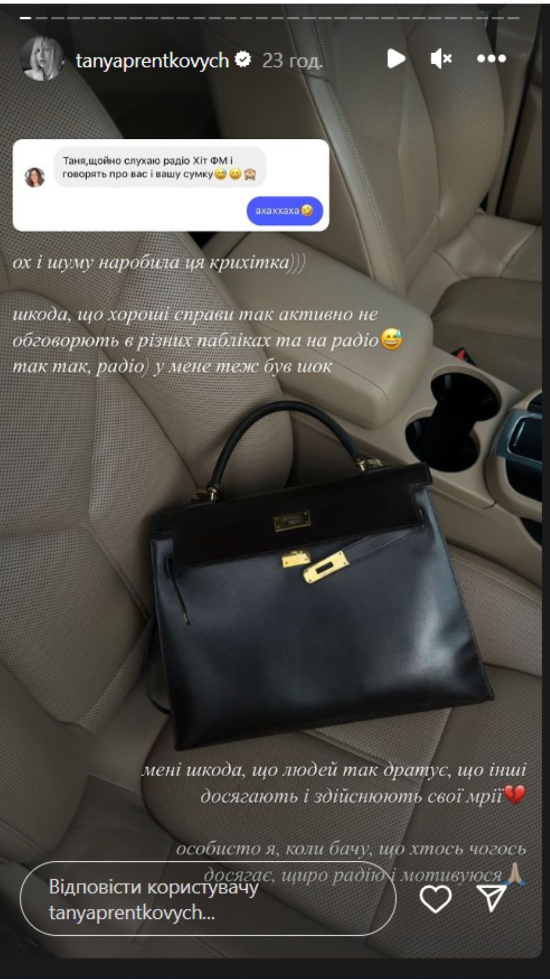 Таня Пренткович відреагувала на хейт через дорогу сумку / Скриншоти з інстаграм-сторіс