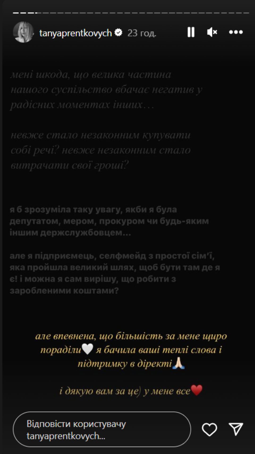 Водночас вона поділилася, що багато підписників її підтримали й написали теплі слова у дірект.