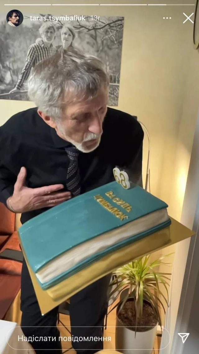 Сім'я приготувала сюрприз для іменинника. У святковий день йому вручили торт у вигляді книжки в синій обкладинці з написом "Василь Цимбалюк" та свічками з числом 68. Зазначимо, тато Тараса Цимбалюка працює вчителем історії.