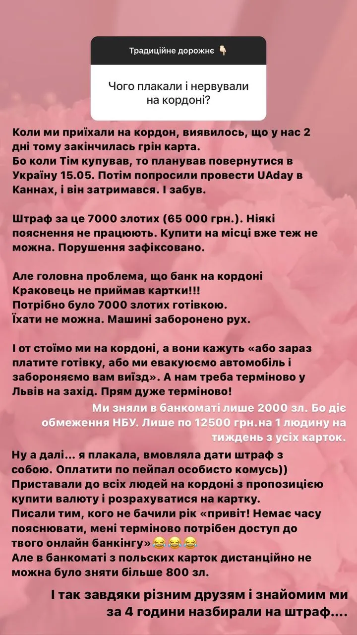 "Головна проблема, що банк на кордоні Краковець не приймав картки. Потрібно було 7000 злотих готівкою. Їхати не можна. Машині заборонено рух. І от ми стоїмо на кордоні, а вони кажуть: "Або зараз платите готівку, або ми евакуюємо автомобіль і забороняємо вам виїзд"".