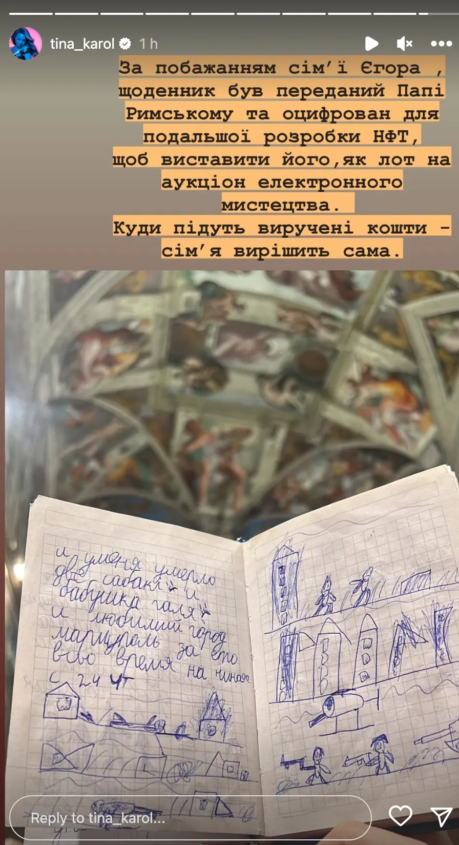 Кароль також повідомила, що рішення про передачу щоденника у Ватикан прийняла сім’я Єгора. Він буде оцифрований та виставлений на аукціон. "Куди підуть виручені кошти – сім’я вирішить сама", – відповіла зірка.
