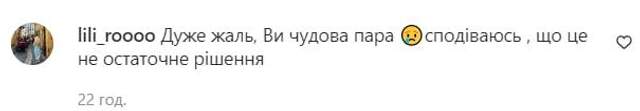 - "Дуже шкода. Я так вірила у вашу пару, так все було гармонійно. Не знаю причину, але справжня любов не минає. Якщо є ще хоч малесенька іскорка, боріться один за одного".