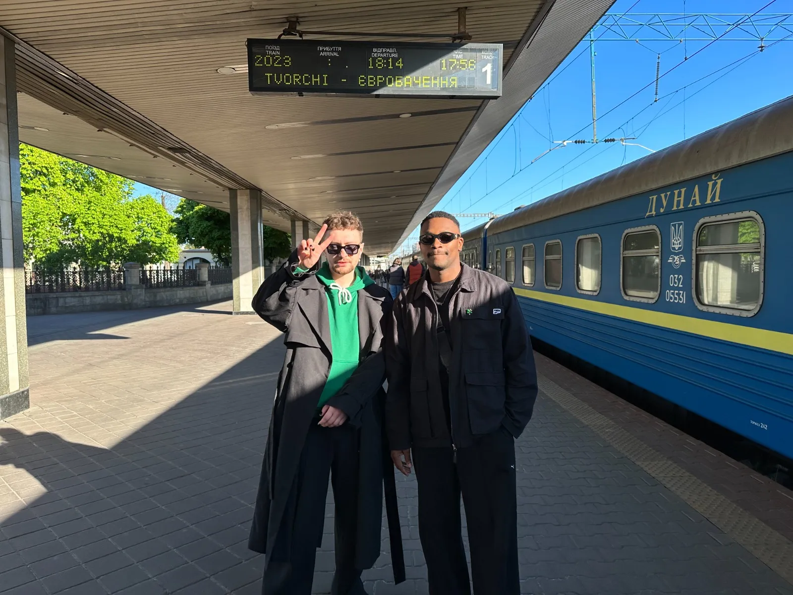 "Вітаємо вас на рейсі Укрзалізниці "Київ – Варшава". Ми ваші попутники до Польщі, звідки відправимося в Ліверпуль", – оголосили Андрій Гуцуляк і Джеффрі Кенні в потязі й радо фотографувалися з фанами, роздавали автографи. Він був по-справжньому зірковий, адже разом з хлопцями їхали Олександра Заріцька з гурту KAZKA та Alekseev, а костюми їм на платформу приніс сам дизайнер Іван Фролов.