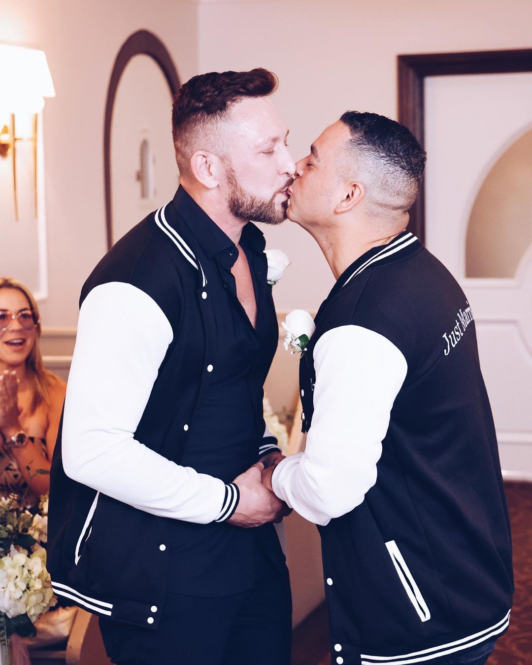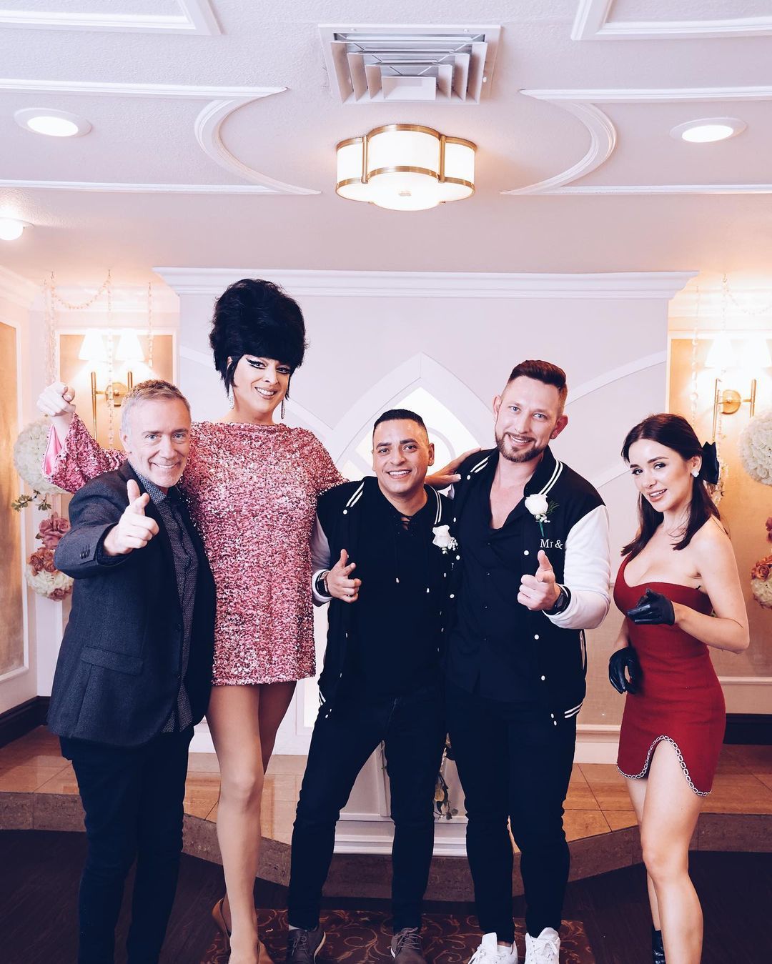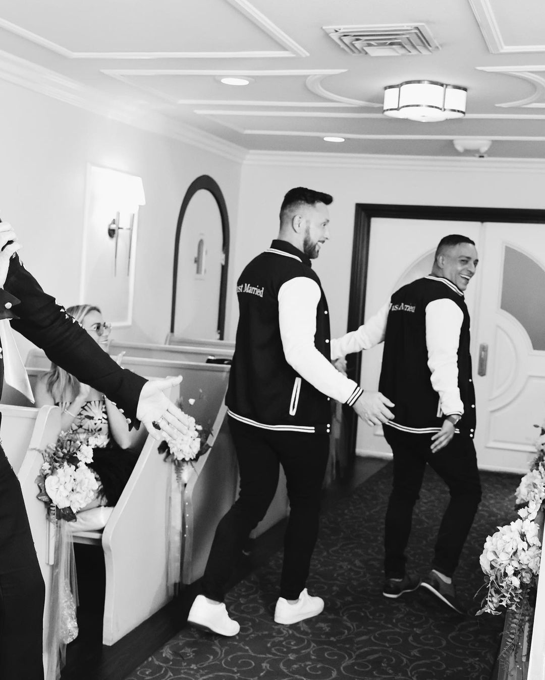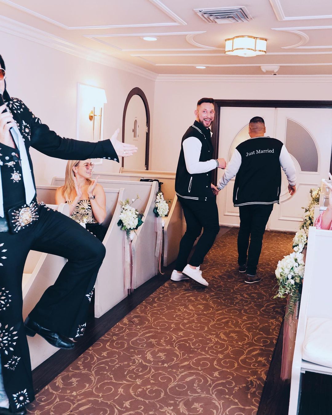 Закохані вдруге обмінялися каблучками на весільній церемонії у Вегасі. Для церемонії вони обрали оригінальні образи – штани, темні сорочки, кеди та бомбери з підписами на спині – Just Married (буквально – щойно одружені).