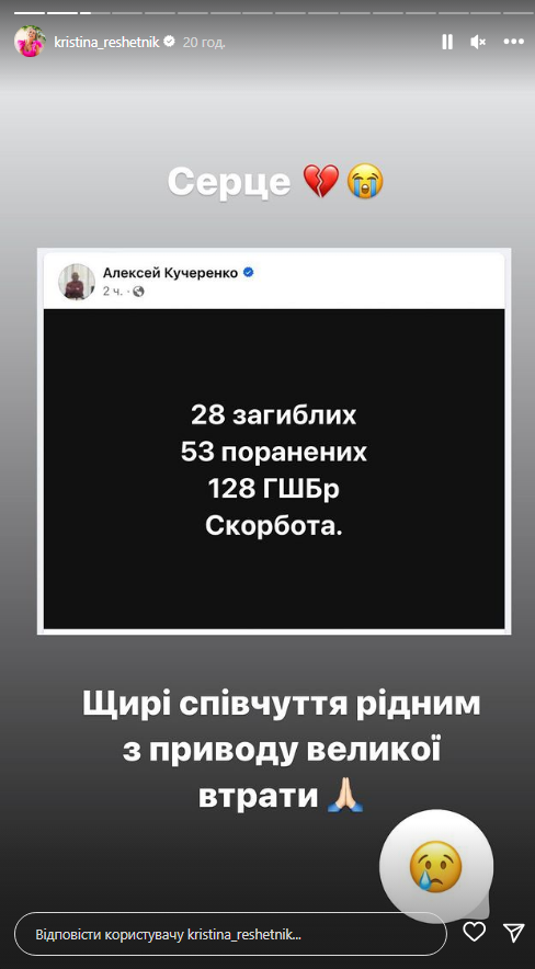 Внаслідок цього є чимало загиблих та постраждалих. Українські зірки емоційно реагують на обстріл. Вони публікують інстаграм-сторіс, де розповідають про трагедію, висловлюють співчуття родинам загиблих та постраждалих і закликають донатити на українську армію, передає 24 Канал.
