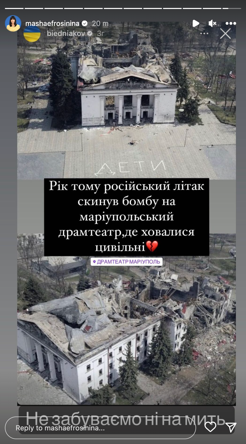 Український шоумен родом з Маріуполя, тож він завжди з болем реагує на цинічні дії росіян в рідному місті. Бєдняков також не зміг не пригадати страшний авіаудар по драмтеатру. Він написав в Instagram-Stories, що рік тому російський літак скинув бомби на будівлю.