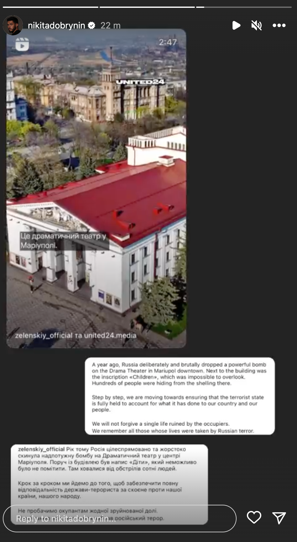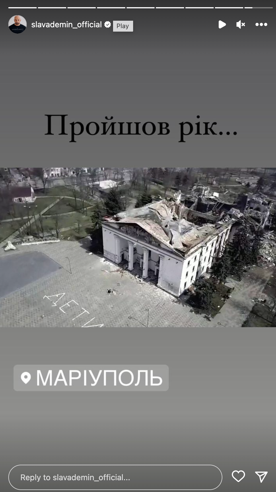 Ведучий також поділився з підписниками кадрами знищеного драмтеатру. "Рік тому Росія вчинила теракт в Маріуполі, влучивши в драмтеатр, де знайшли прихисток сотні цивільних", – написав він.