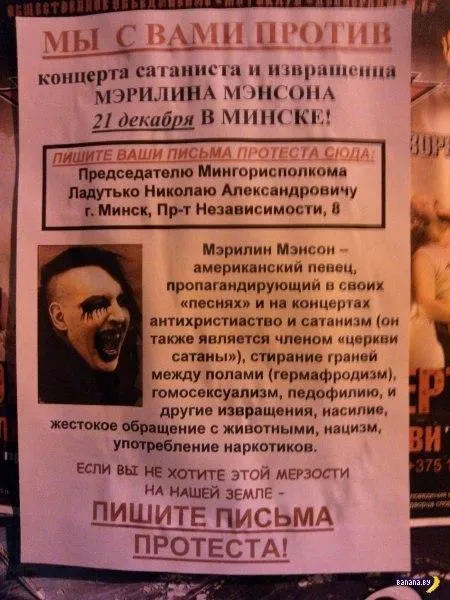 Нагадаємо, концерт Меріліна Менсона в Мінську заплановано на 21 грудня. А концерт всесвітньовідомого шок-рок гурту в Україні відбудеться 20-го грудня в столичному Палаці Спорту.
